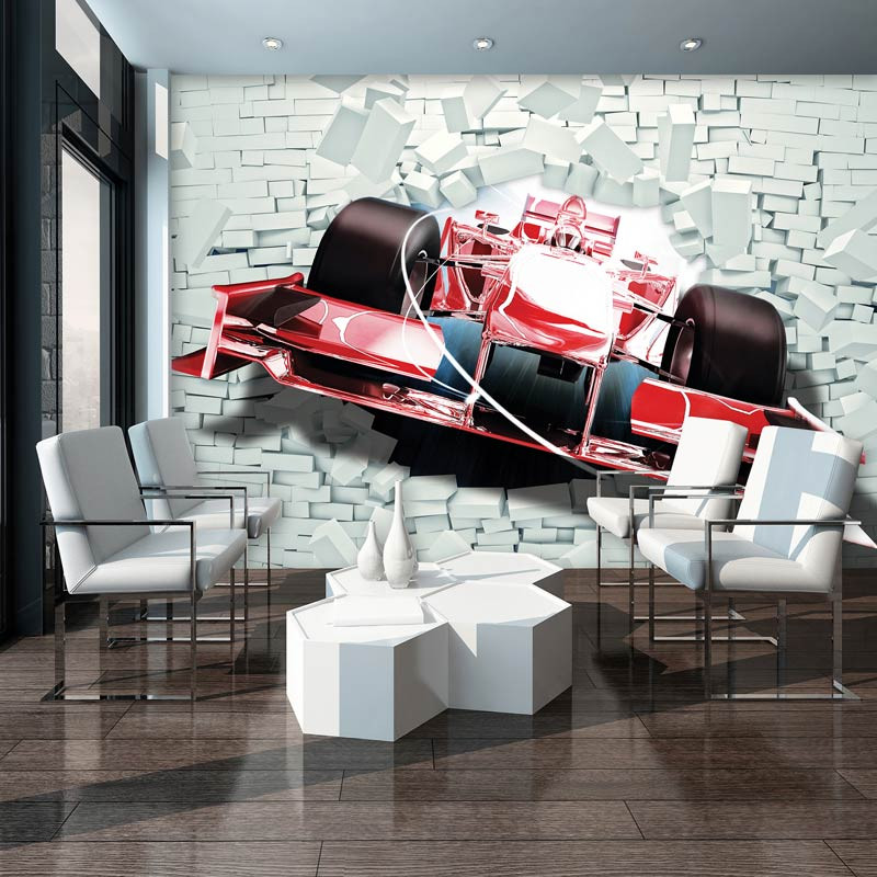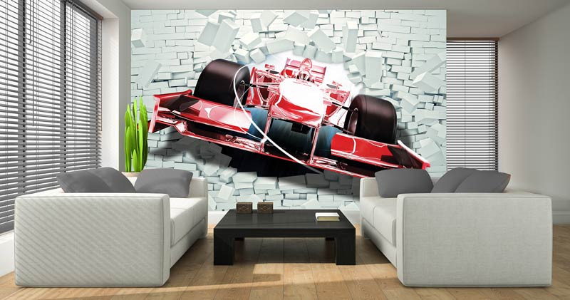 Fototapete für echte Formel 1 Liebhaber. Fototapete mit einem roten Formel 1 Auto, das durch die Wand in Ihr Zimmer zu fahren scheint.