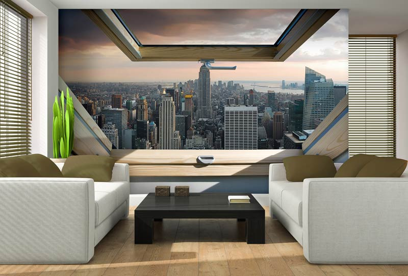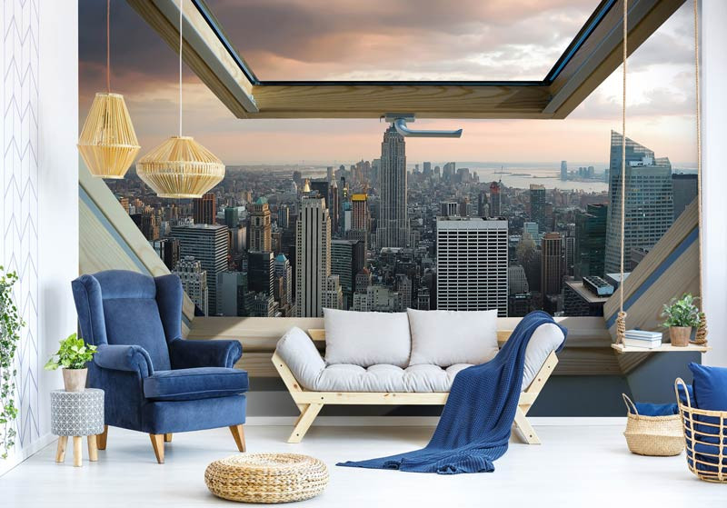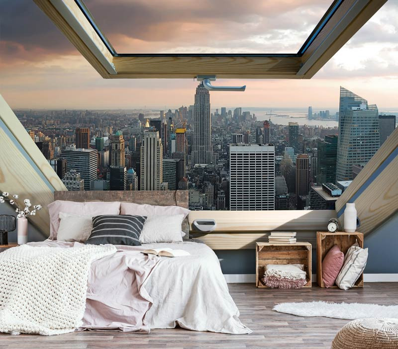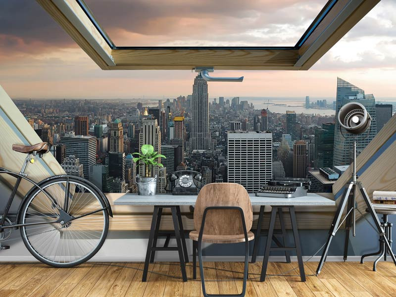 Vlies-Fototapete mit dem Blick aus dem Dachfenster der amerikanischen Stadt New York, gerendert in 3D.