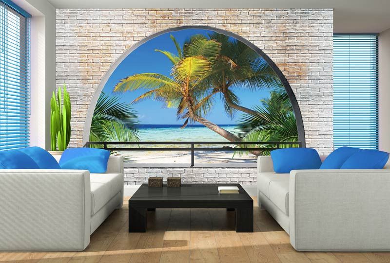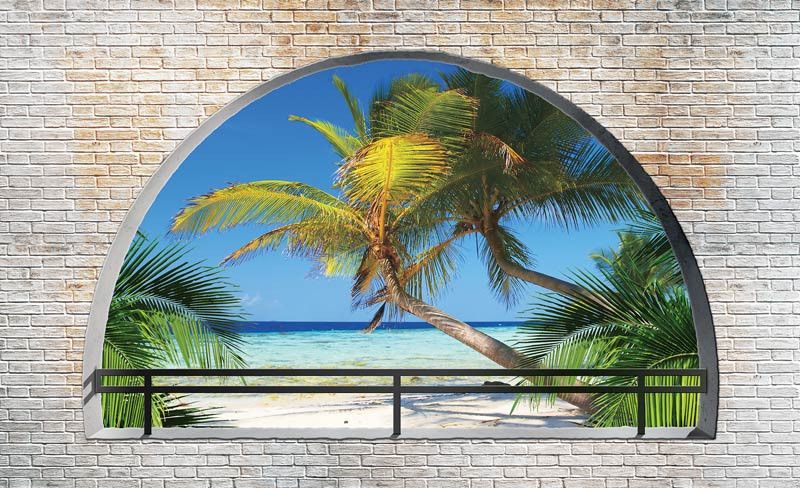 3D-Fototapete mit Blick auf Palmen und das Meer von der Steinwand aus.