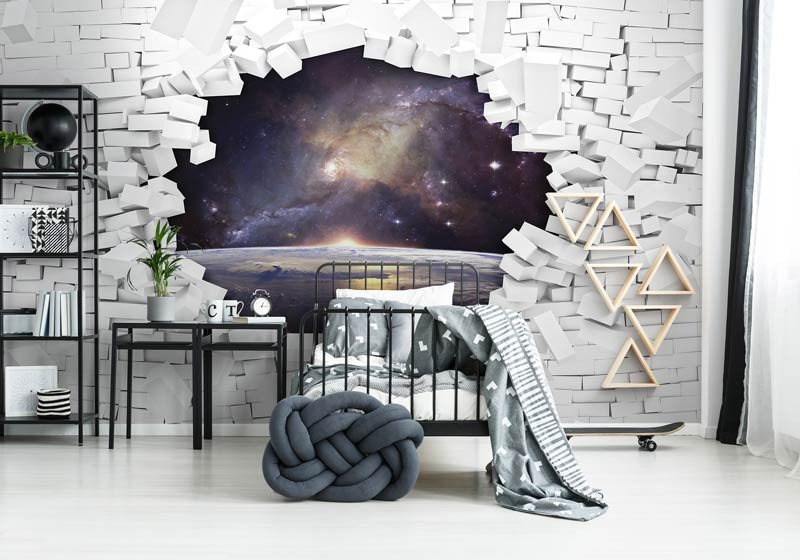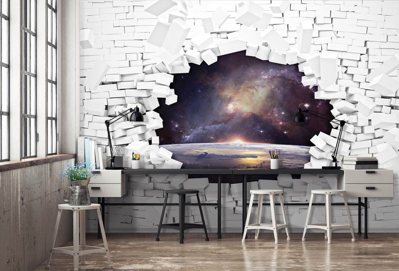 3D Fototapete einer gebrochenen Wand mit dem Universum im Hintergrund.