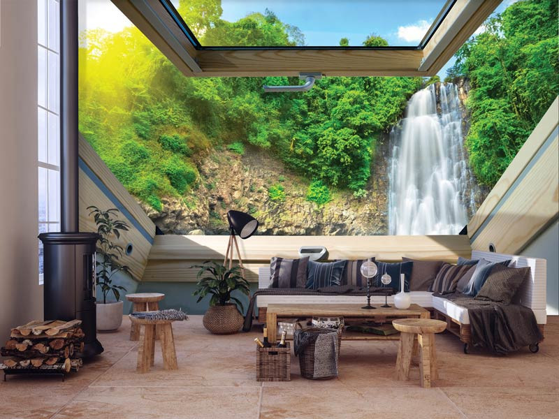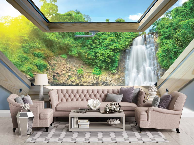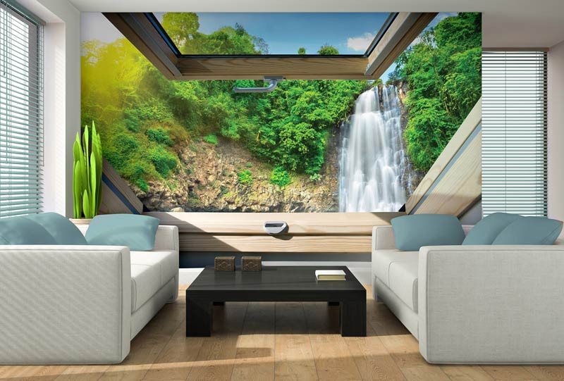 Vlies-Fototapete mit Blick aus dem Dachfenster auf einen Wasserfall, gerendert in 3D.