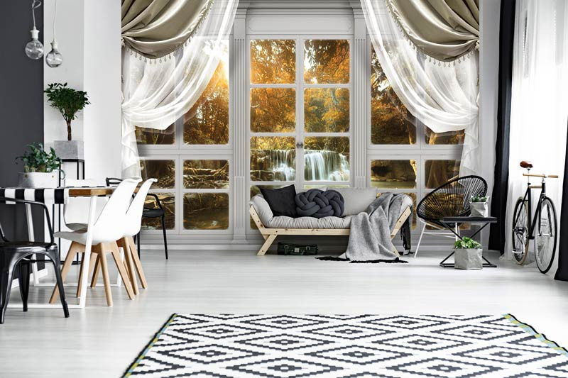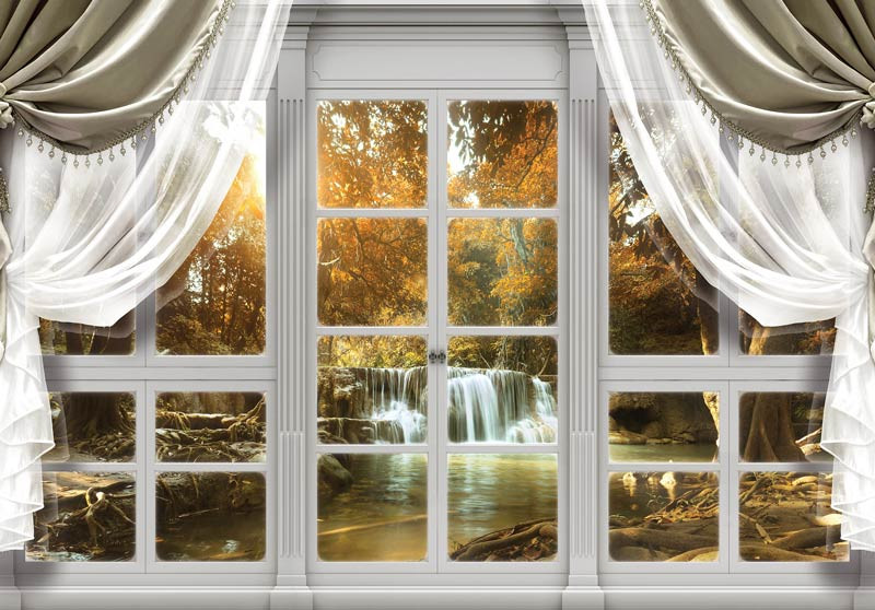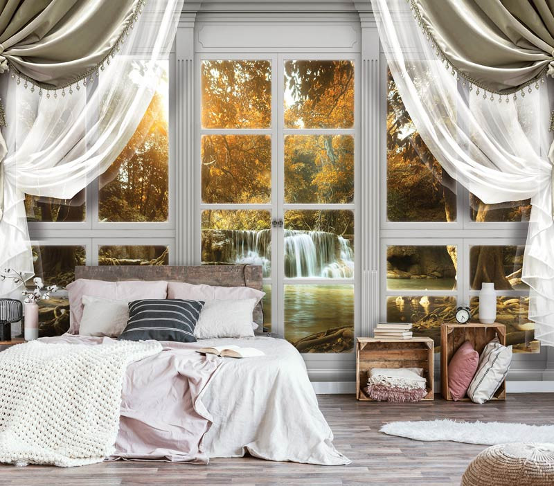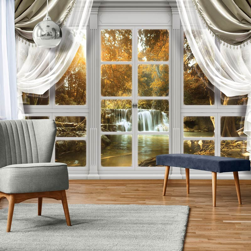 3D Vliestapete mit dem Blick auf einen Wasserfall in einem schönen, herbstlichen Wald, aus dem Fenster gesehen.