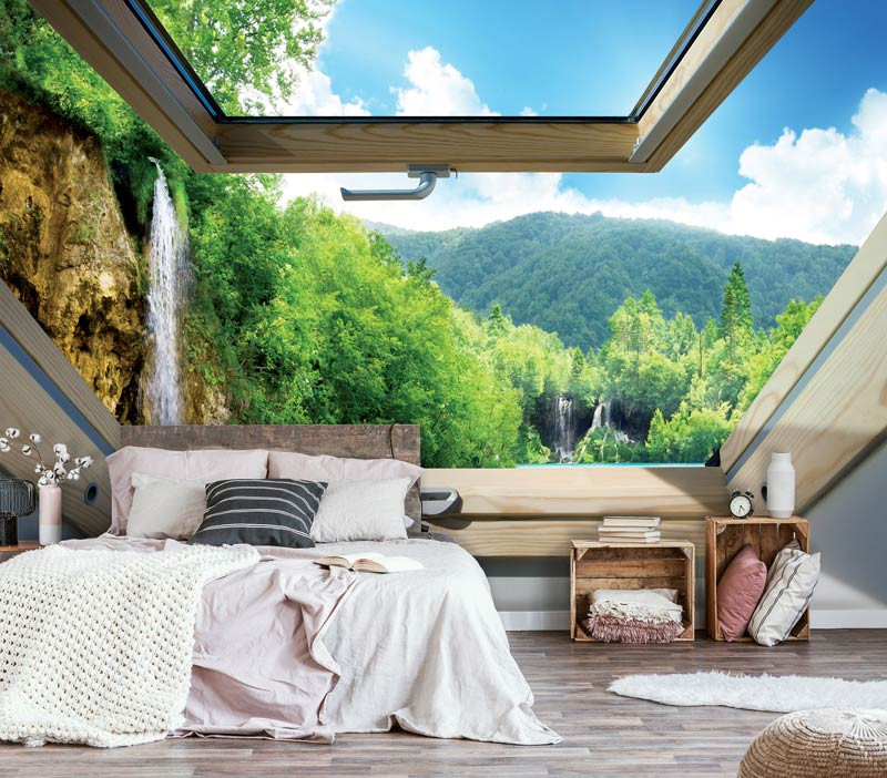 Vlies-Fototapete der Blick aus dem Dachfenster der Wasserfälle im Wald, in 3D gerendert.