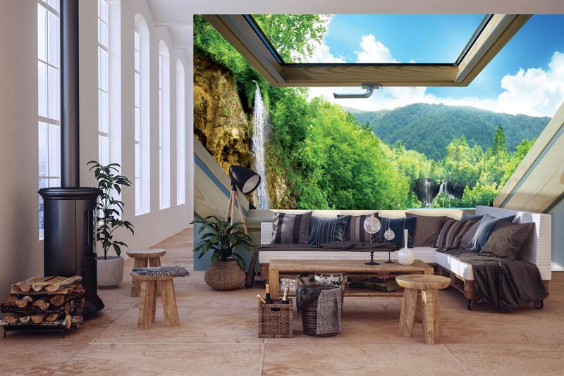 3D Fototapete Blick aus dem Fenster auf die Wasserfälle im Wald.