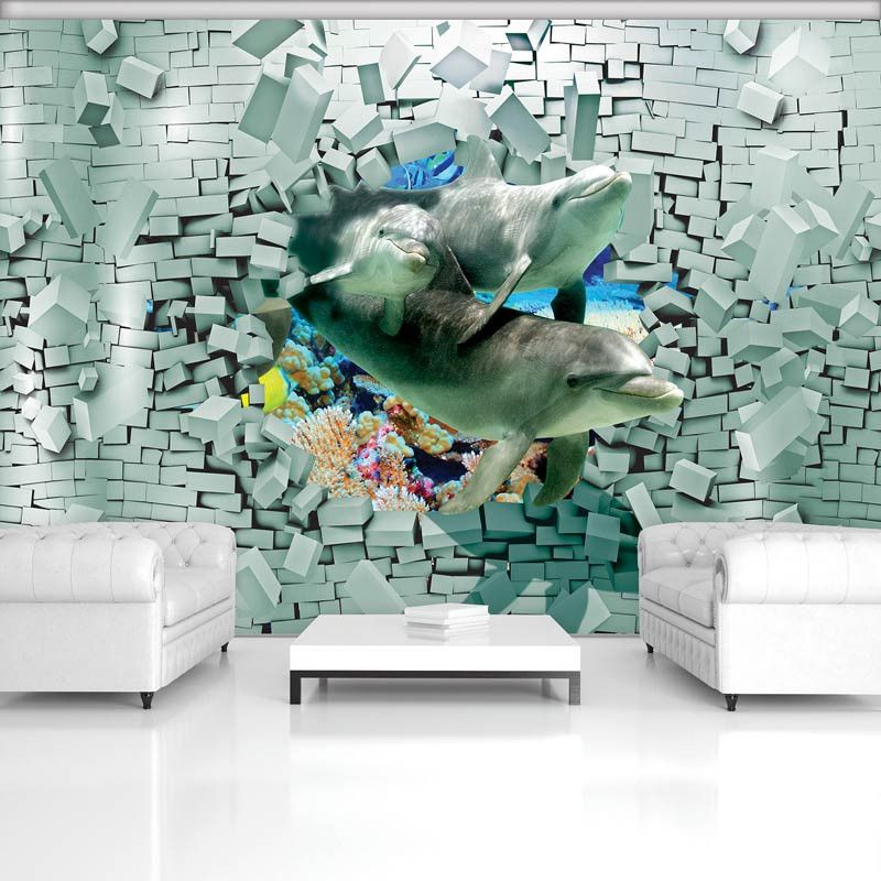 3D Tapete von Delfinen im Meer, die scheinbar durch die Wand hindurch direkt in Ihr Zimmer schwimmen.