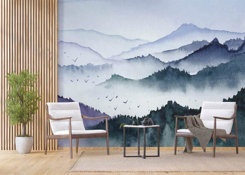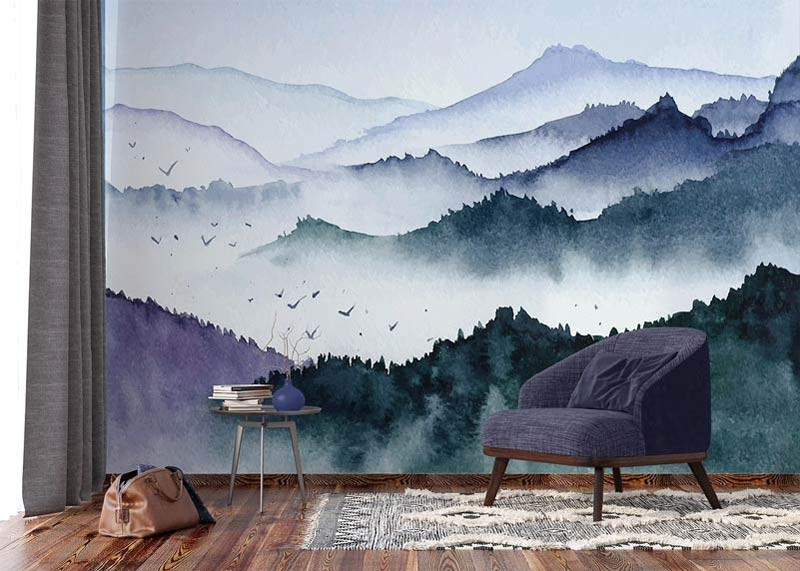 Erleben Sie die verträumte Atmosphäre von Bergen im Nebel mit dieser Aquarell-Fototapete. Die sanften Blautöne und der Aquarell-Effekt sorgen für einen ruhigen Look, ideal für entspannende Räume. Diese Tapete lässt sich einfach auf Maß bestellen.