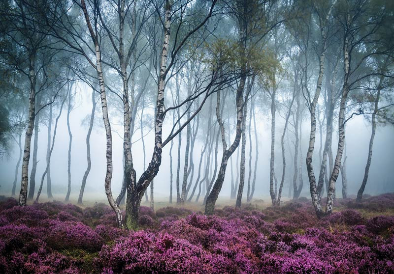 Fototapete eines wunderschönen, nebligen Birkenwaldes voller prächtiger Blumen und Bäume.