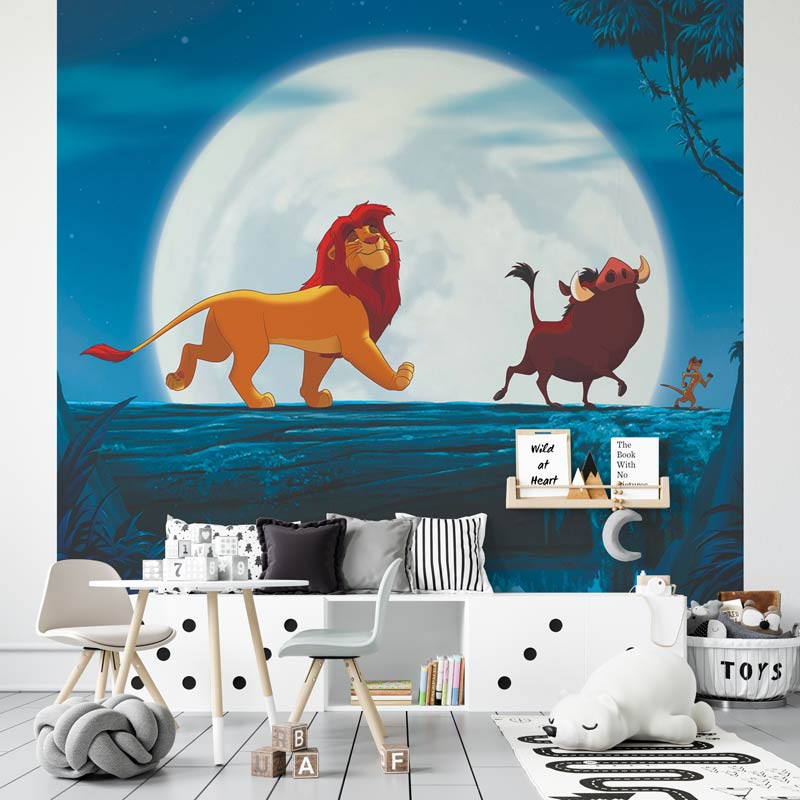 Die Fototapete zeigt Simba, Pumbaa und Timon. Der ideale Weg, um die Dschungelatmosphäre ins Kinderzimmer zu bringen.
