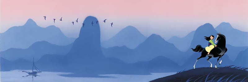 Die Berge und das Wasser ruhen sanft in den frühen Morgenstunden, wenn Mulan bereits mit ihrem Pferd Khan unterwegs ist.