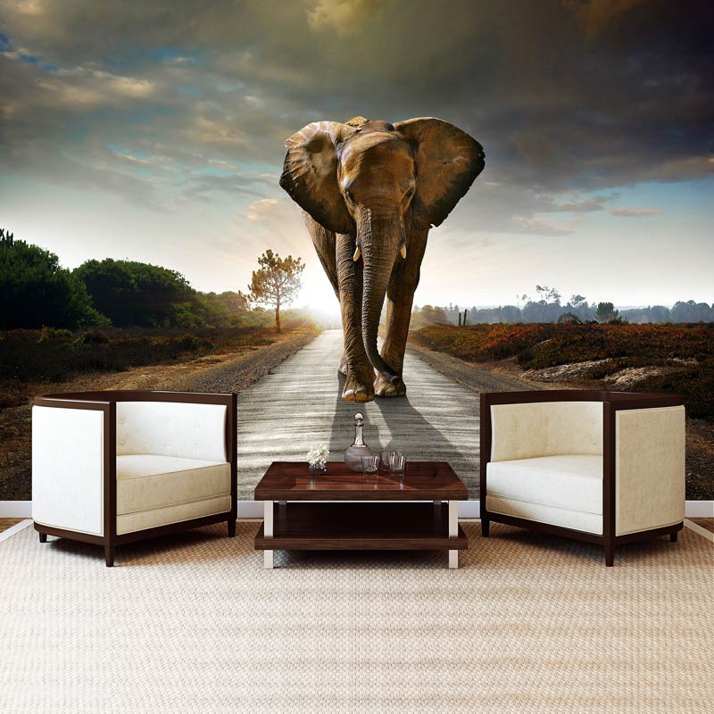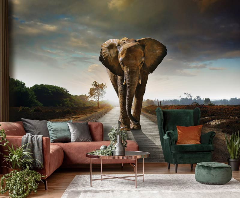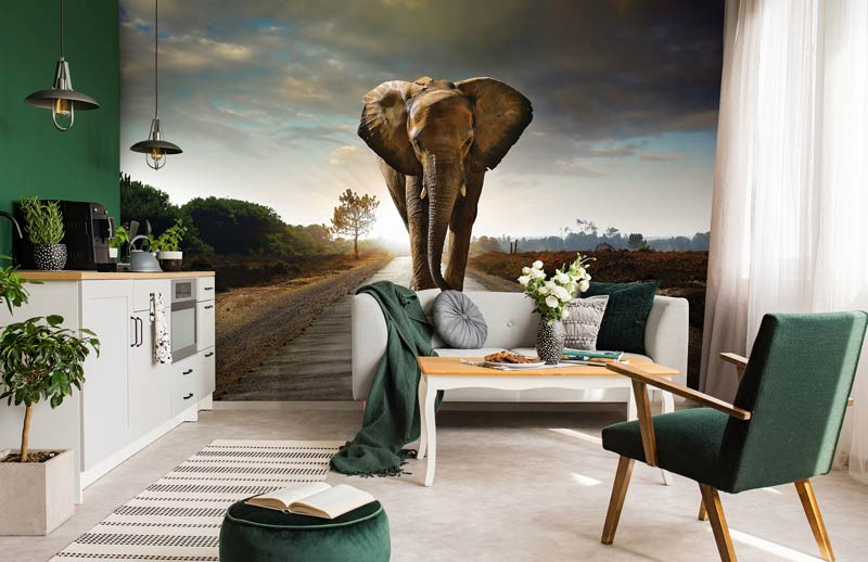 Fototapete mit einem wunderschönen Elefanten, der direkt in Ihr Zimmer zu kommen scheint.
