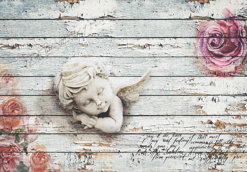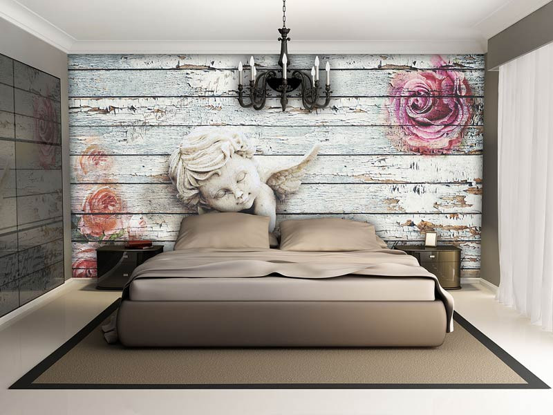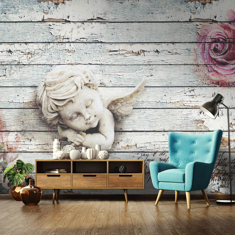 Fototapete eines Engels und Rosen, angezeigt auf alten Holzbrettern.