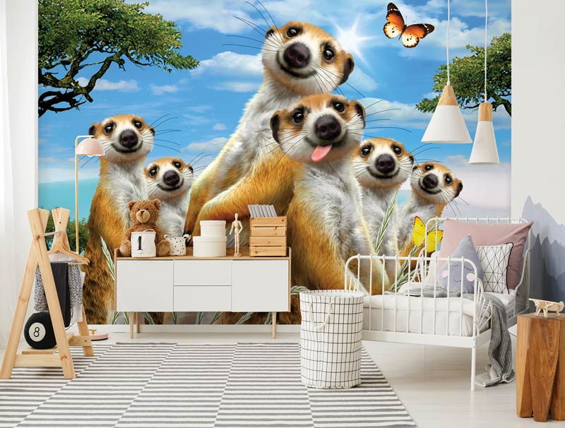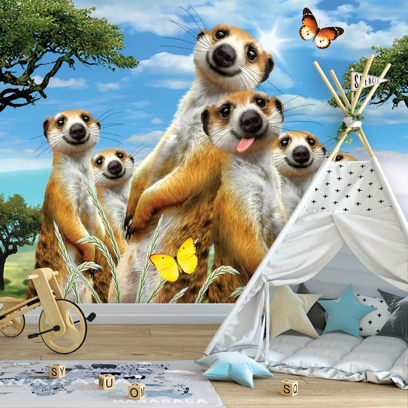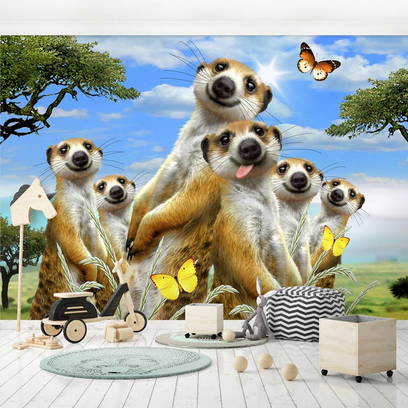 Vlies-Fototapete mit drolligen Erdmännchen, die zusammen ein tolles Foto gemacht haben! Ein Must-Have für jedes Kinderzimmer.