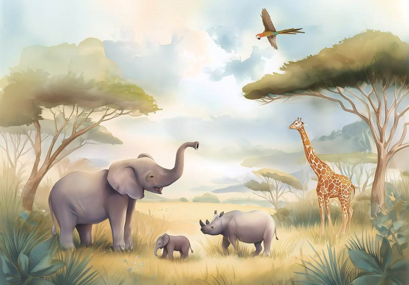 Breng de warmte en magie van de Afrikaanse savanne in huis met dit prachtige fotobehang. Het ontwerp toont een vrolijke olifantenfamilie, nieuwsgierige neushoorns, een elegante giraf en een kleurrijke papegaai, allemaal te midden van hoge bomen en een zacht verlichte horizon. De speelse en vriendelijke illustratiestijl maakt dit behang ideaal voor een kinderkamer of babykamer.