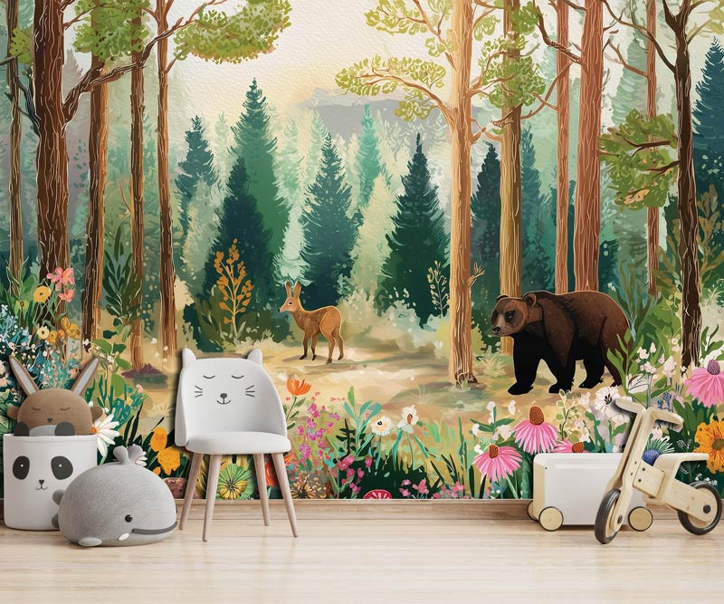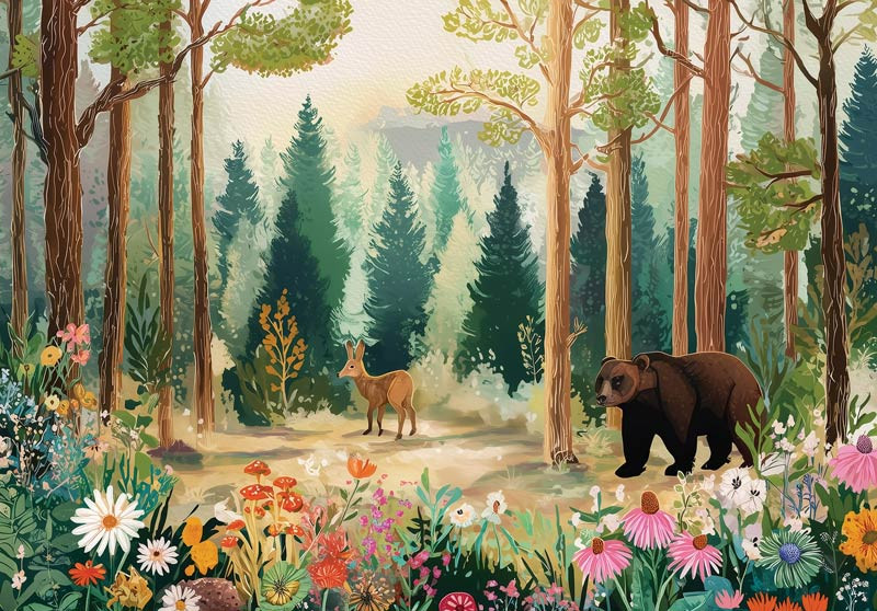 Een prachtig bos vol hoge bomen, kleurrijke bloemen en bijzondere dieren vormt de basis van dit unieke ontwerp. Terwijl een hert rustig door de open plek loopt, verschijnt er op de voorgrond een indrukwekkende beer, waardoor de scène een sprookjesachtige uitstraling krijgt.