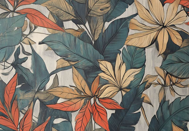 Haal de sfeer van een tropisch woud in huis met dit indrukwekkende fotobehang. Het ontwerp toont grote, kunstzinnig getekende bladeren in warme tinten oranje, oker en diep groen, die prachtig afsteken tegen een subtiele, lichte achtergrond. De gedetailleerde lijnen en rijke kleuren geven een krachtig, modern accent aan je interieur.