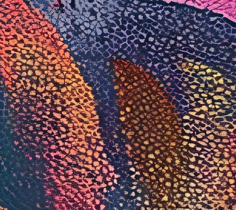 Lassen Sie sich von einer Explosion aus Farben umgeben mit dieser künstlerischen Fototapete eines farbenfrohen Blätterdachs. Im Design sind unzählige kleine Punkte und zellartige Strukturen sichtbar, die an eine Mischung aus Blattadern und abstrakter Kunst erinnern. Diese organischen Punktmuster verleihen dem Gesamtbild zusätzliche Tiefe und machen das Motiv einzigartig und lebendig.