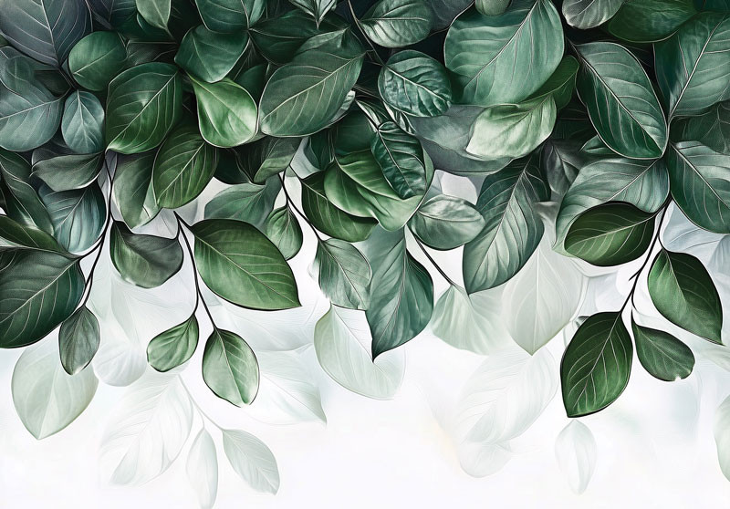 Haal de frisse energie van de natuur in huis met dit prachtige fotobehang. Het ontwerp toont een weelderig patroon van groene bladeren die sierlijk over een lichte achtergrond hangen. De heldere groentinten en subtiele schaduwen zorgen voor een levendige, rustgevende uitstraling die perfect past in een moderne woonkamer, slaapkamer of kantoor.