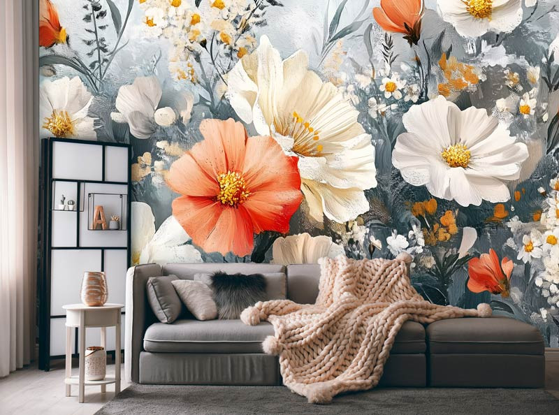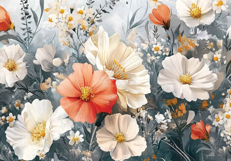Voeg een artistiek statement toe aan je interieur met dit prachtige fotobehang. Het ontwerp toont een rijk geschilderd veld vol oranje, crème en witte bloemen, die lijken te zijn opgezet met grove penseelstreken in acrylstijl. De combinatie van warme kleuren en grijstinten zorgt voor een levendige en karaktervolle uitstraling.