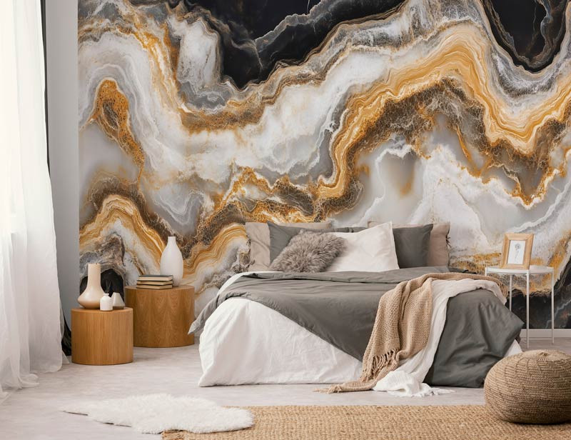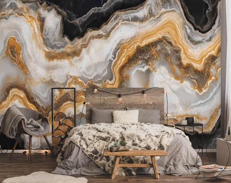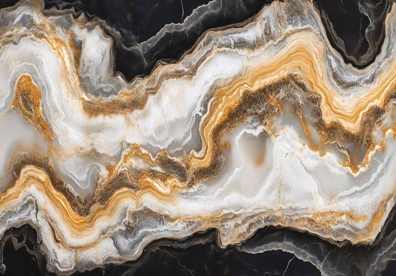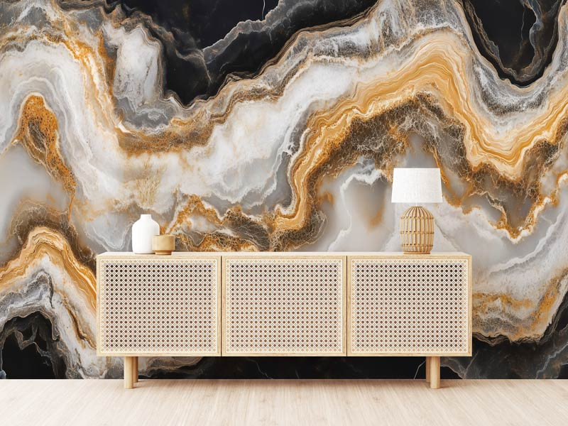 Dit elegante fotobehang toont een golvend marmerpatroon in diepe zwart-wittinten, verrijkt met luxe goudaccenten. De vloeiende lijnen en glanzende uitstraling zorgen voor een chique, moderne sfeer in huis.