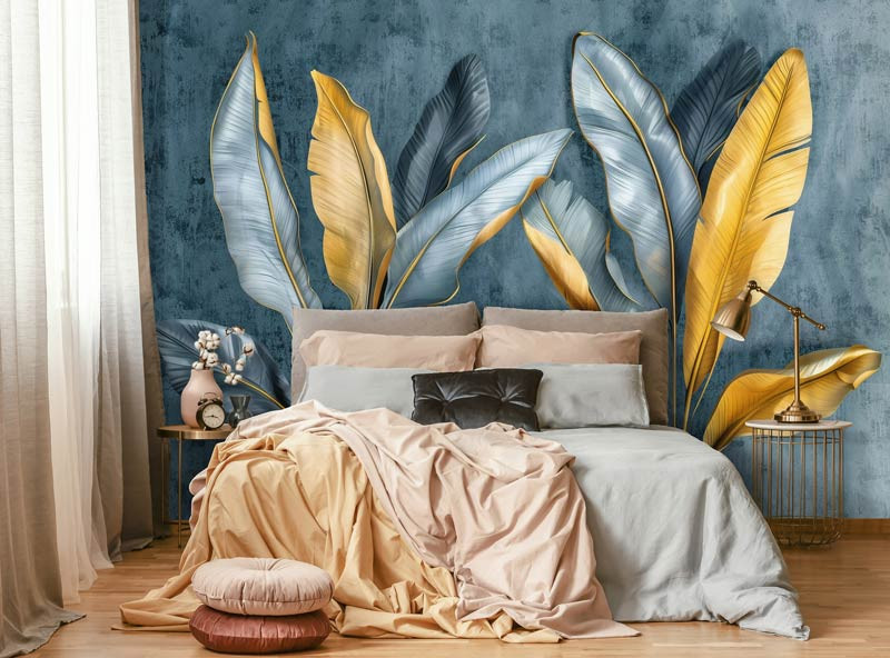 Voeg een tropische, jungle touch toe aan je interieur met dit fotobehang van gouden bananenbladeren. De combinatie van goud en diepe kleuren geeft het behang een luxe en exotisch karakter.