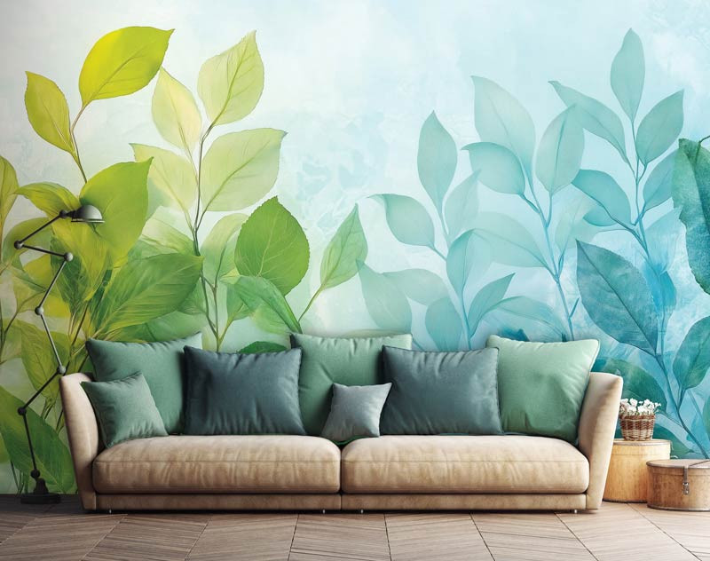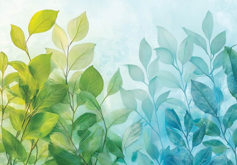 Voeg een frisse en moderne touch toe aan je interieur met dit opvallende fotobehang. Het ontwerp toont een prachtige overloop van levendige groene naar zachte blauwe bladeren, die samen een luchtige en natuurlijke sfeer creëren. De subtiele kleuren en verfijnde details maken dit behang perfect voor woonkamers, slaapkamers of kantoren waar je een stijlvol botanisch accent wilt aanbrengen.