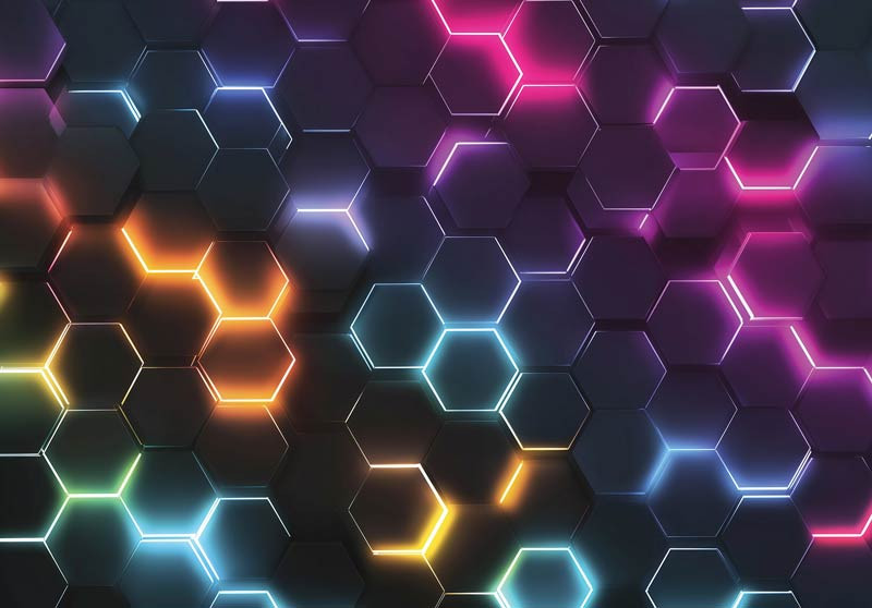 De diepte en lichtreflecties in het ontwerp geven de muur een driedimensionale uitstraling, waardoor het lijkt alsof de hexagons uit de muur naar voren komen. Het neonlicht creëert een energieke en levendige sfeer die zowel speels als stijlvol oogt. Daarmee is dit fotobehang niet alleen een kunstzinnige toevoeging, maar ook een echte blikvanger voor je interieur.