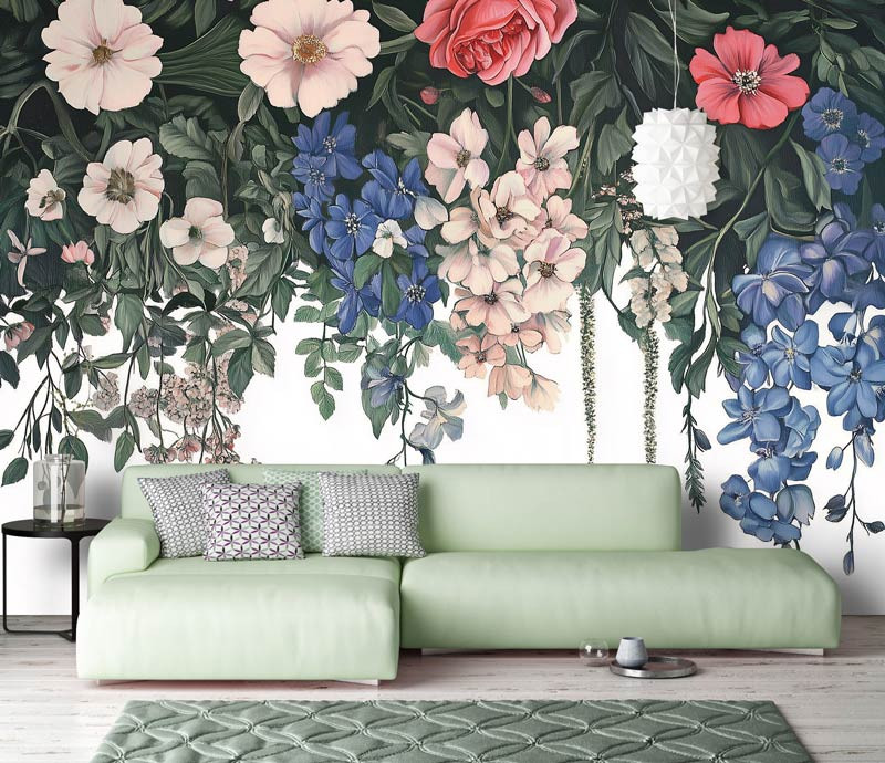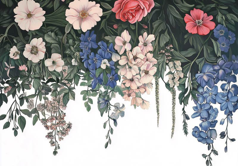 Maak een krachtig statement in je interieur met dit indrukwekkende fotobehang. Het ontwerp toont een waterval van bloemen in rijke tinten roze, blauw, wit en groen, die sierlijk naar beneden hangen tegen een donkere bladachtergrond. De combinatie van kleuren en details zorgt voor een levendig, luxe effect dat elke ruimte omtovert tot een stijlvol kunstwerk.