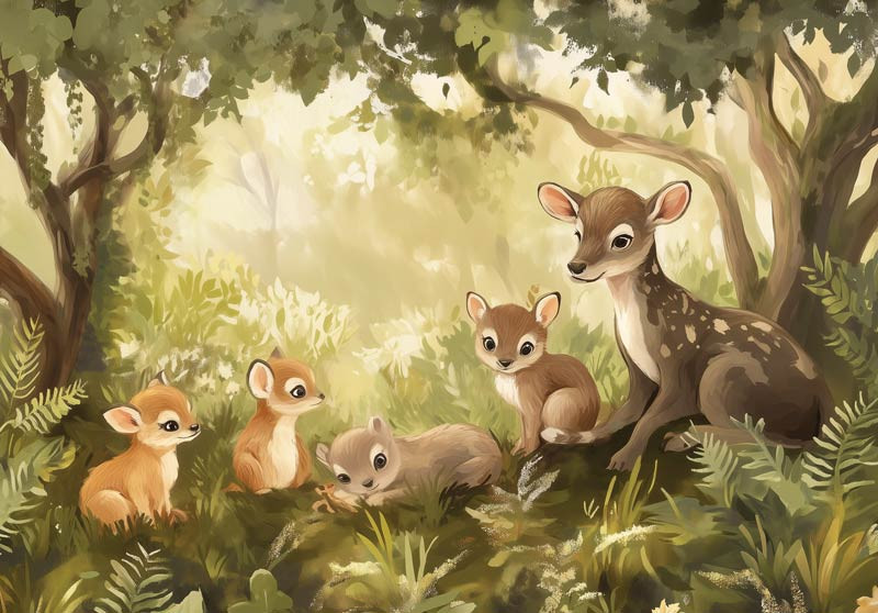 Creëer een warme, uitnodigende sfeer in de kinderkamer met dit lieve fotobehang. Het ontwerp toont een groep schattige bosdieren, waaronder hertjes en een eekhoorn, die samen spelen in een zonnig bos. De zachte groene tinten, warme lichtval en vriendelijke dieren zorgen voor een knusse, sprookjesachtige uitstraling die kinderen laat wegdromen in hun eigen bosavontuur.