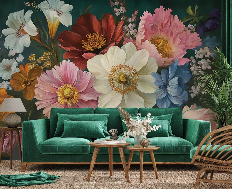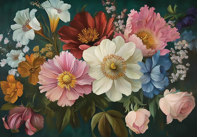 Geef je interieur een stijlvolle upgrade met het fotobehang luxe bloemen in klassieke sfeer. Dit ontwerp toont een kleurrijk en gedetailleerd bloemenboeket in olieverfstijl, met weelderige bloemen in rood, wit, roze, blauw en oranje tegen een diepe groene achtergrond. De compositie straalt warmte, luxe en vakmanschap uit – alsof je naar een meesterwerk kijkt.