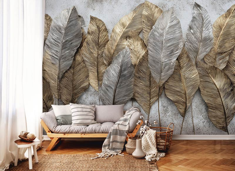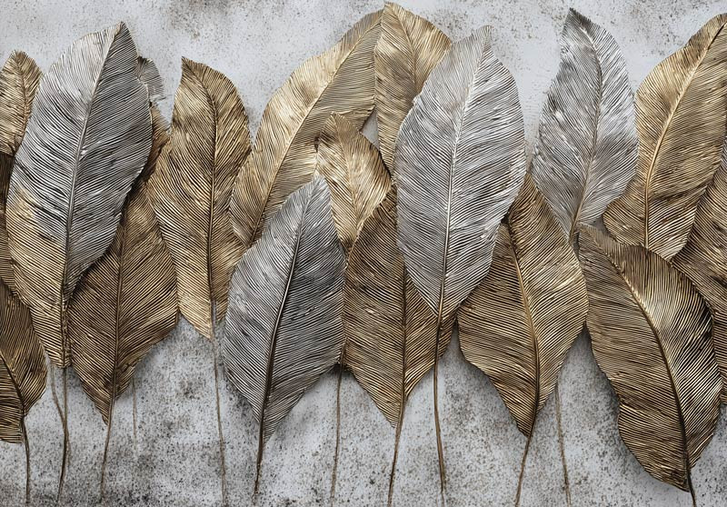 Laat je muur schitteren met een verfijnde mix van goud en zilver. De bladeren zijn met oog voor detail vormgegeven, waardoor de nerven en structuren haast tastbaar lijken. Het contrast tussen de warme goudtinten en de koele zilveraccenten zorgt voor een luxueus en modern effect.