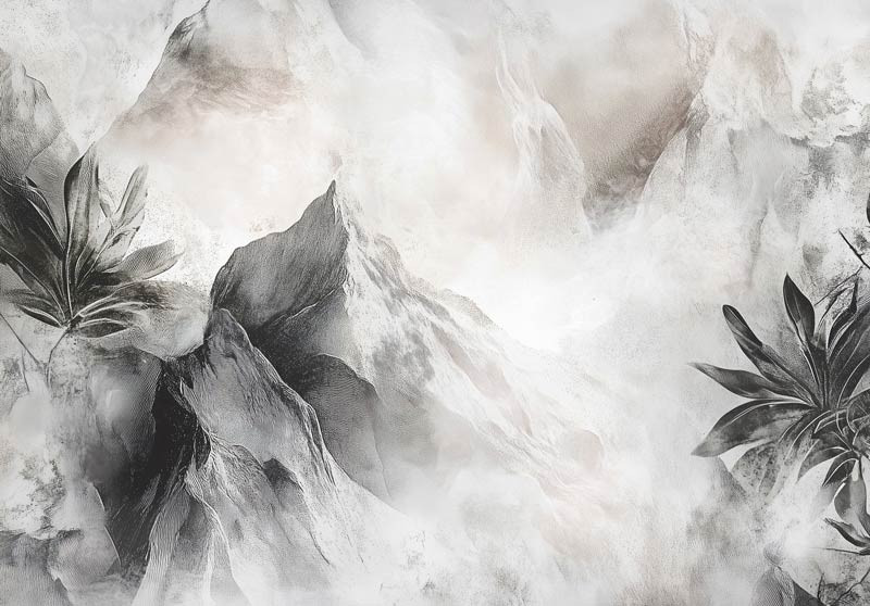 Laat je meevoeren naar een mysterieuze wereld met dit fotobehang van een mistig berglandschap omringd door tropische bladeren. De nevel tussen de bergen in combinatie met het weelderige groen op de voorgrond creëert een betoverend diepte-effect.