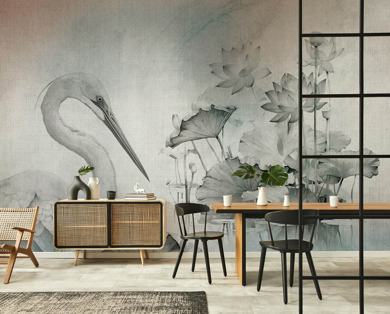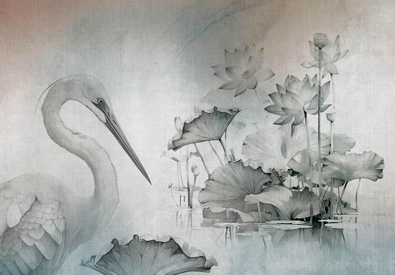 Een sierlijke kraanvogel staat tussen lotusbloemen en zachte waternevel. De verfijnde, oosterse tekentstijl en gedempte grijstinten brengen kalmte en klasse aan iedere wand.