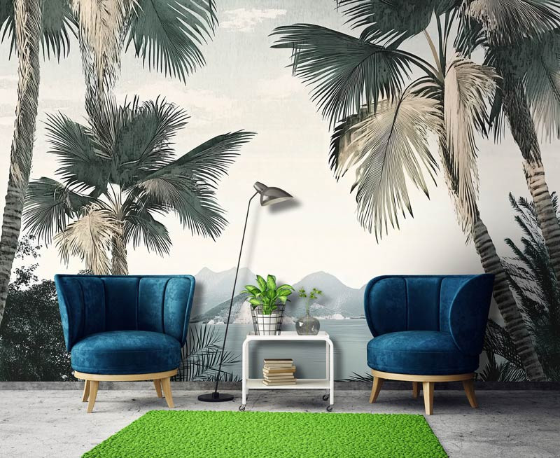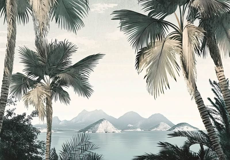 Haal de tropische sfeer van zon, zee en strand in huis met dit fotobehang van palmbomen aan een heldere kustlijn. De wuivende bladeren en lichte lucht brengen direct vakantiegevoel in elke ruimte.