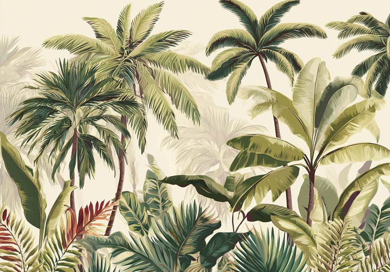 Laat je meeslepen naar een exotisch landschap vol weelderige palmbomen en tropische bladeren. De groentinten variëren van fris lichtgroen tot diepe junglekleuren, waardoor de muur een levendig en warm karakter krijgt.