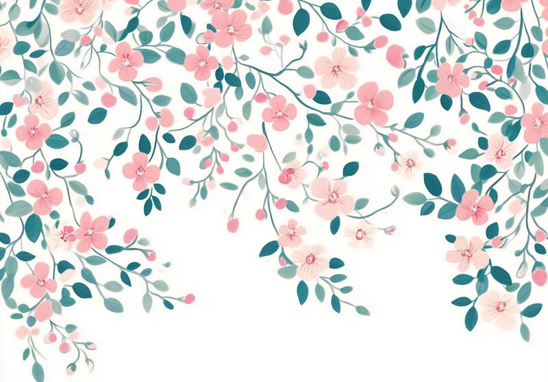 Breng een frisse en vrolijke sfeer in huis met dit speelse fotobehang. Het ontwerp toont sierlijke takken vol roze bloesems en groene bladeren die elegant over een witte achtergrond hangen. De zachte kleuren en luchtige compositie geven de ruimte een lichte en levendige uitstraling.