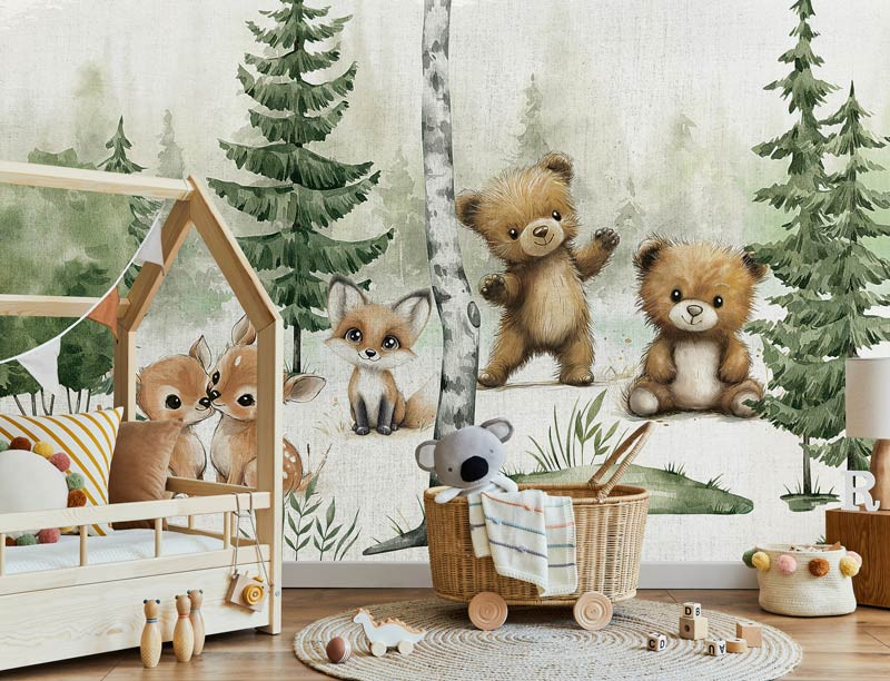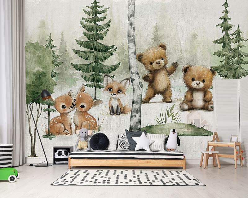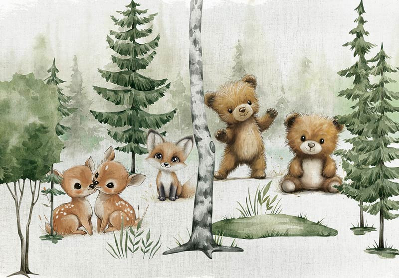 Breng een vrolijke en liefdevolle sfeer in de kamer met dit speelse ontwerp. Twee knuffelige beren, een vosje en twee hertjes zijn afgebeeld in een fris groen bos, omringd door bomen en zachte kleuren. De illustratieve stijl maakt het geheel extra warm en uitnodigend.