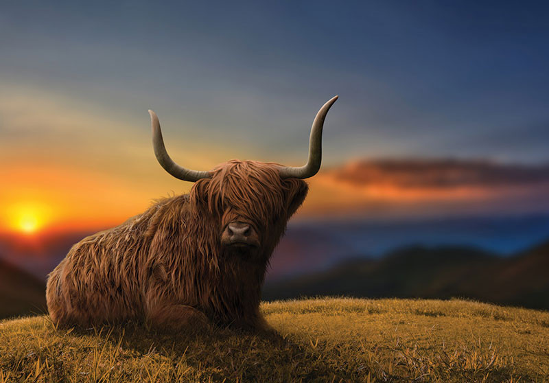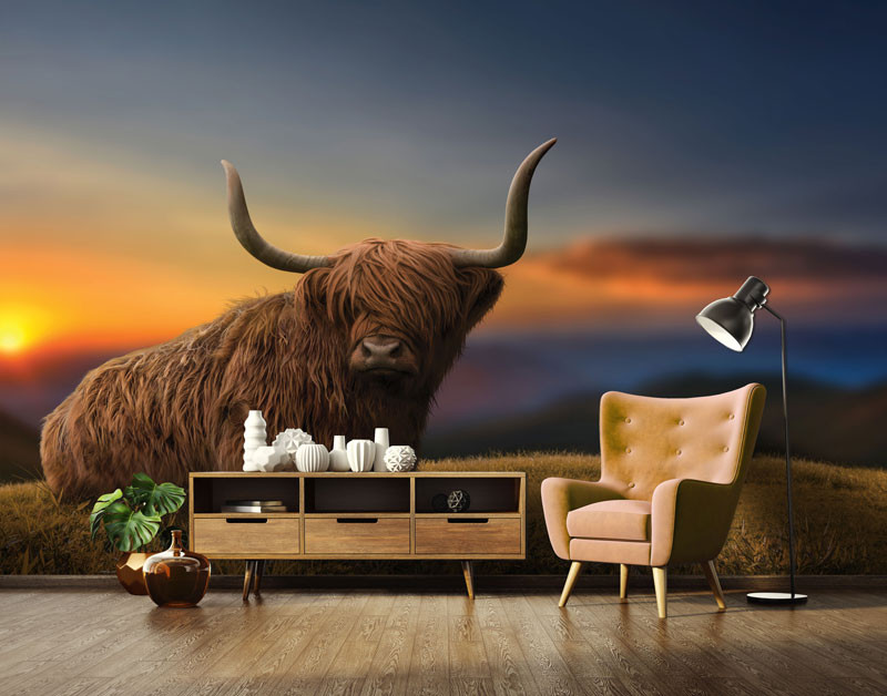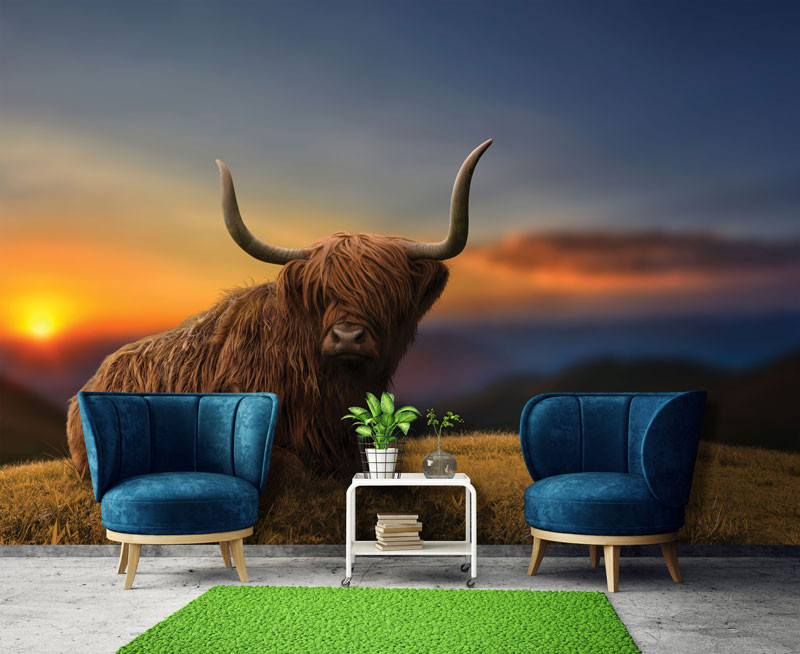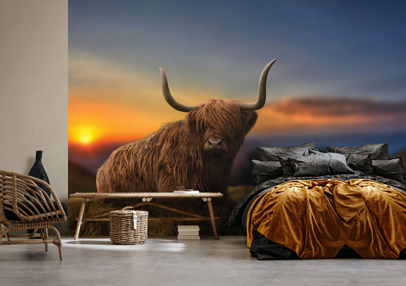 Fotobehang Schotse Hooglander bij Zonsondergang