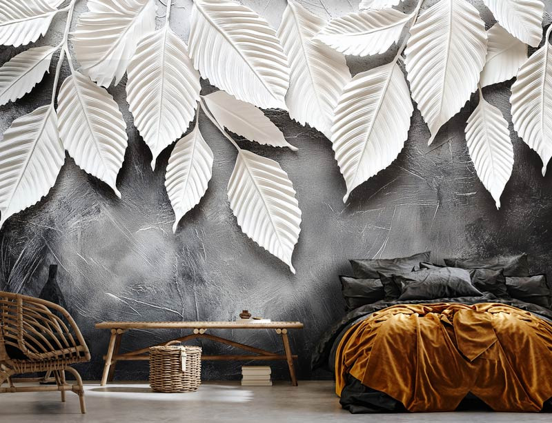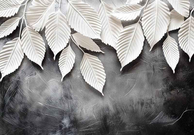 Geef je interieur een luxe en moderne uitstraling met dit opvallende fotobehang. Het ontwerp toont elegante witte bladeren die prachtig afsteken tegen een donkere, verweerde achtergrond, waardoor een krachtig en stijlvol contrast ontstaat. De verfijnde details in de bladeren en de textuur van de achtergrond geven dit behang een chique en artistieke uitstraling, ideaal voor een woonkamer, slaapkamer of kantoor waar je een statement wilt maken.