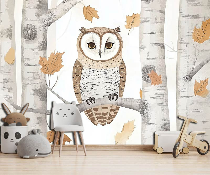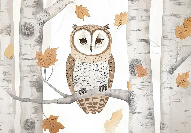 Een stijlvolle illustratie van een uil die rustig op een tak zit, omringd door berkenbomen en herfstbladeren. De zachte kleuren en natuurlijke tinten geven het geheel een warme en kalme uitstraling.