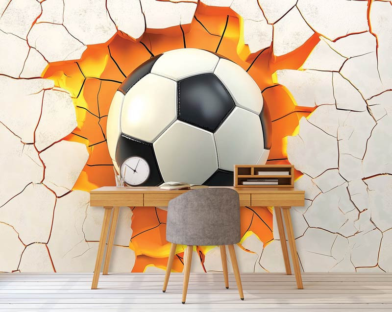 Breng actie in de kamer met het fotobehang voetbal door de muur. Dit stoere ontwerp toont een realistische 3D-voetbal die door een gebarsten wand lijkt te knallen, met vurige accenten op de achtergrond. Het effect zorgt voor diepte en dynamiek, alsof de bal echt uit de muur springt.