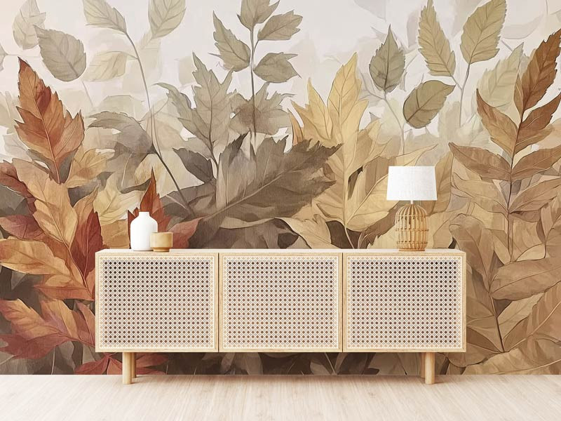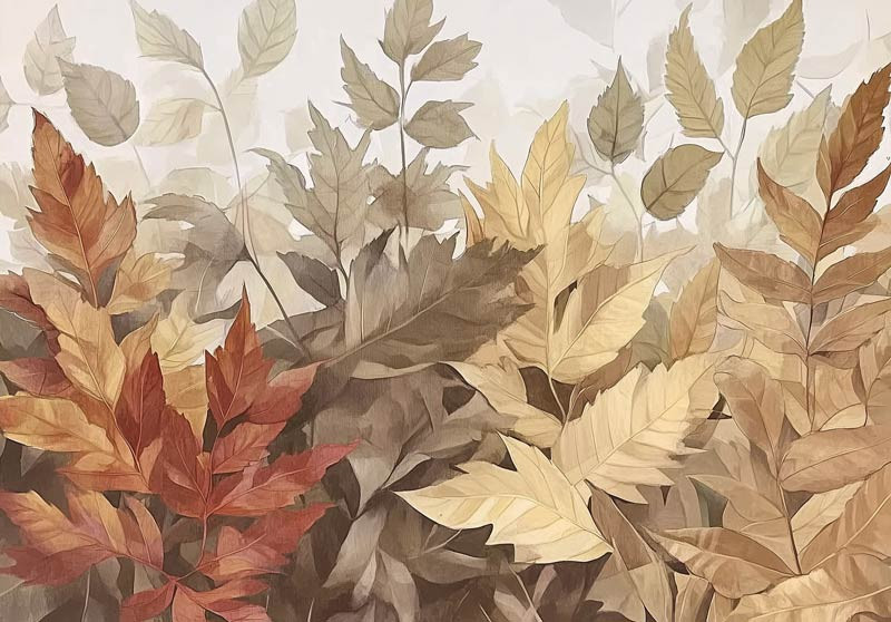 Creëer een warme en uitnodigende sfeer in je interieur met dit prachtige fotobehang. Het ontwerp toont een gelaagde compositie van herfstbladeren in zachte aardetinten zoals rood, bruin, beige en goud. De subtiele penseelstreken en natuurlijke kleuren geven het behang een rustgevende en stijlvolle uitstraling die perfect past in een woonkamer, slaapkamer of kantoor waar je gezelligheid wilt toevoegen.