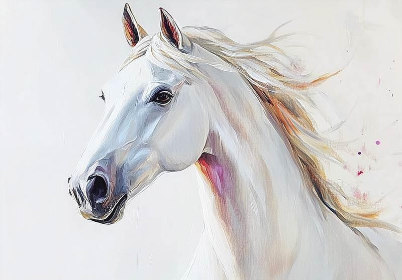 Dit fotobehang toont een indrukwekkende schildering van een wit paard met wapperende manen. De vloeiende penseelstreken en subtiele kleuraccenten geven het ontwerp een kunstzinnige en elegante uitstraling, terwijl de lichte achtergrond zorgt voor een frisse en ruimtelijke sfeer. Het resultaat is een wanddecoratie die kracht, puurheid en schoonheid uitstraalt.