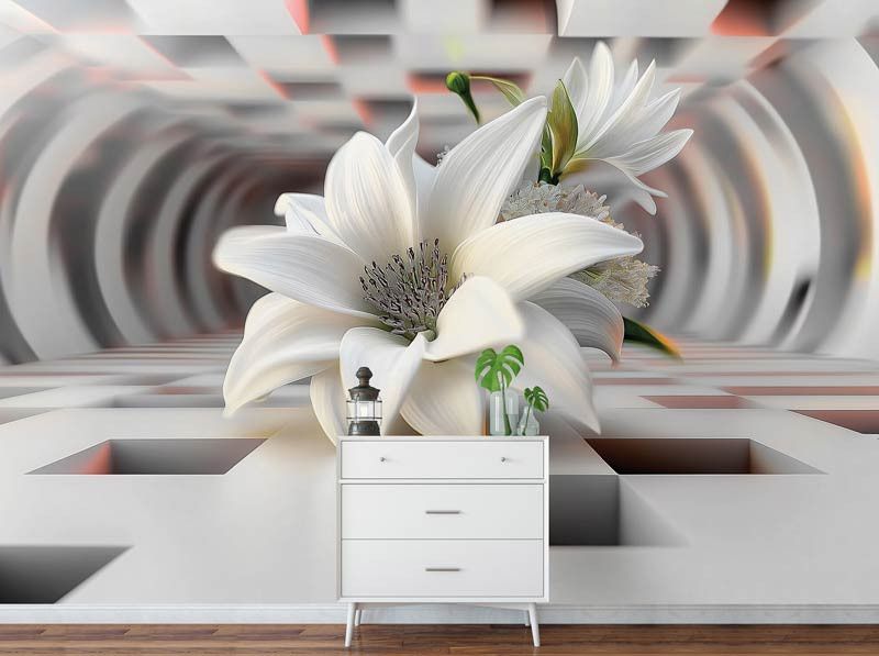 Laat je interieur diepte en verfijning uitstralen met dit fotobehang van witte bloemen in een 3D-tunnel. De compositie zorgt voor een ruimtelijk effect dat meteen de aandacht trekt, zonder overweldigend te zijn.