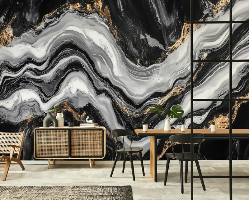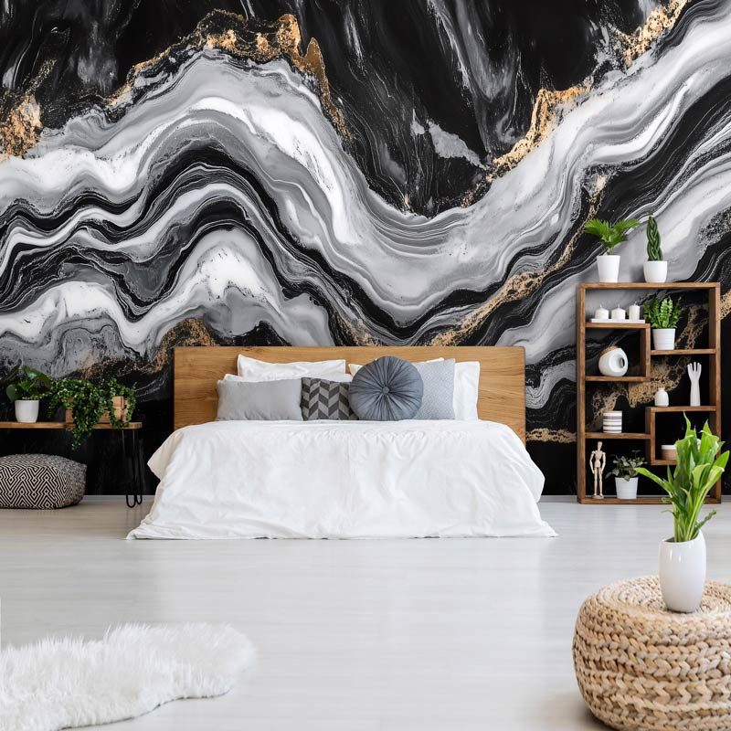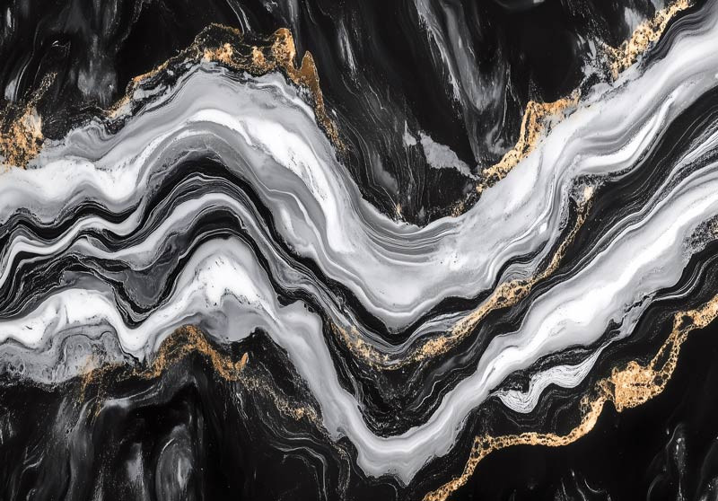 Voeg een krachtig en stijlvol statement toe aan je interieur met dit fotobehang van zwart marmer met gouden accenten. De golvende lijnen en luxe uitstraling maken dit ontwerp perfect voor moderne en chique woonruimtes.