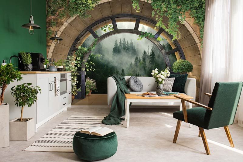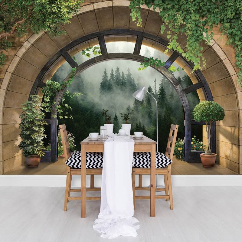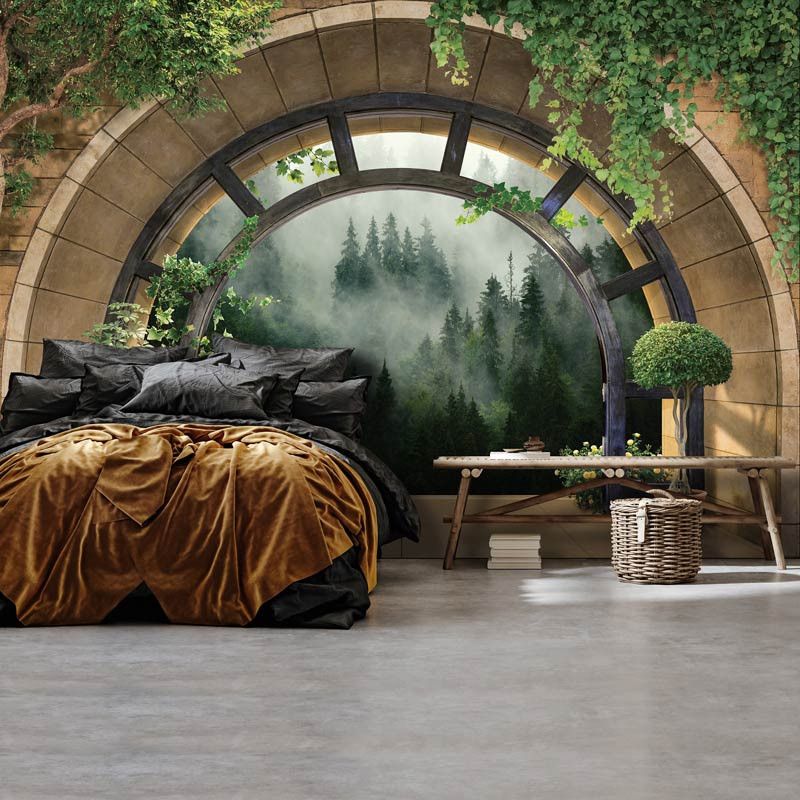Umgeben Sie sich mit dieser 3D-Fototapete mit der mystischen Atmosphäre eines nebligen Waldes. Die Tiefe und die subtilen Farben schaffen eine ruhige und heitere Umgebung, ideal für das Schlafzimmer oder das Wohnzimmer.