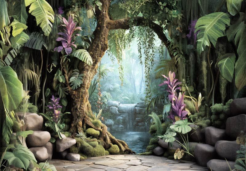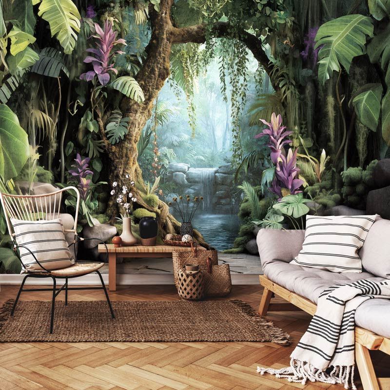 Tauchen Sie ein in ein tropisches Abenteuer mit unserer Fototapete 3D-Dschungelabenteuer. Dieses einzigartige Design erweckt den Dschungel mit einem beeindruckenden dreidimensionalen Effekt zum Leben. Ein Wasserfall, exotische Pflanzen und Tiefeneffekte vermitteln das Gefühl, mitten in der Natur zu sein. Perfekt für Liebhaber tropischer Themen und ein echter Blickfang in jedem Raum.