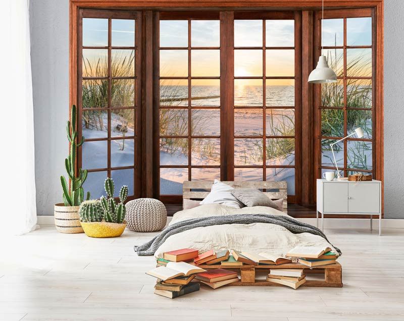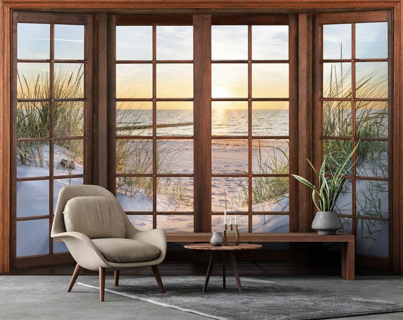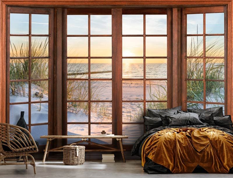 Fototapete 3D Fensteransicht von Dünen, Strand und Meer