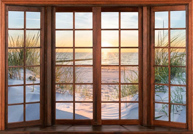 Fototapete 3D Fenster mit Blick auf die Dünen, Strand und Meer
