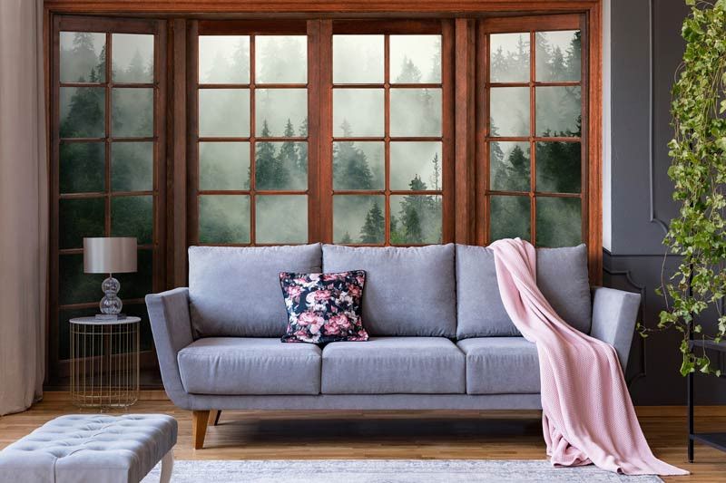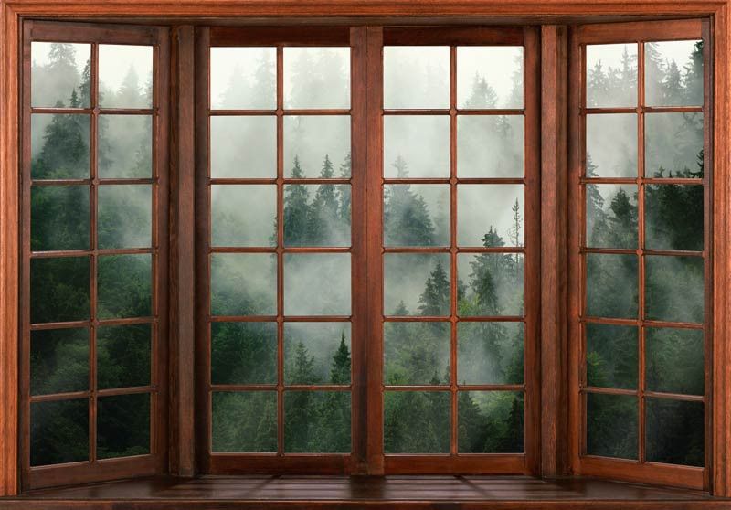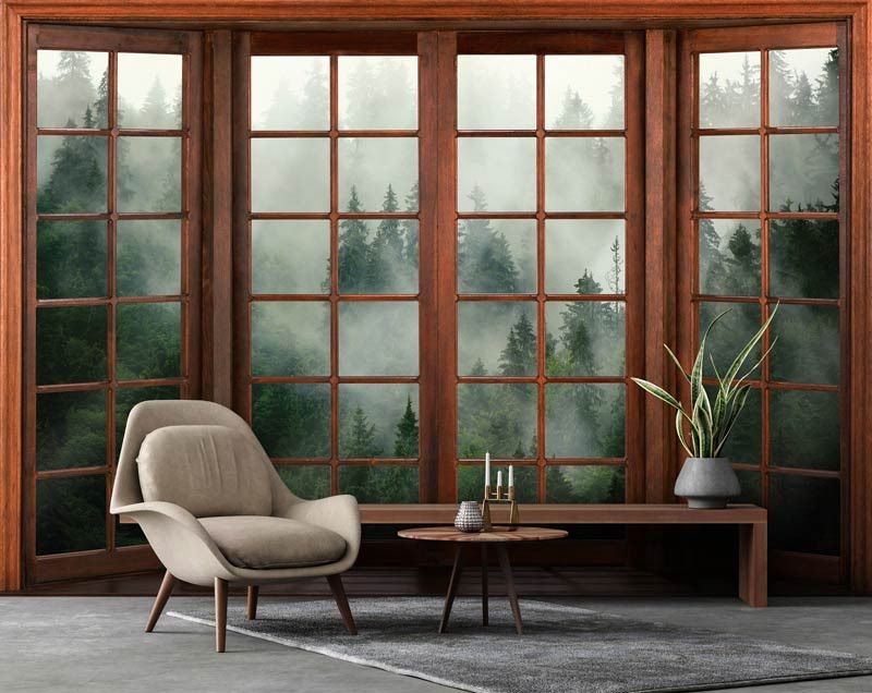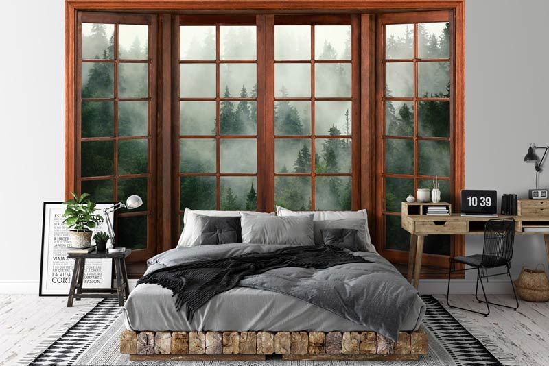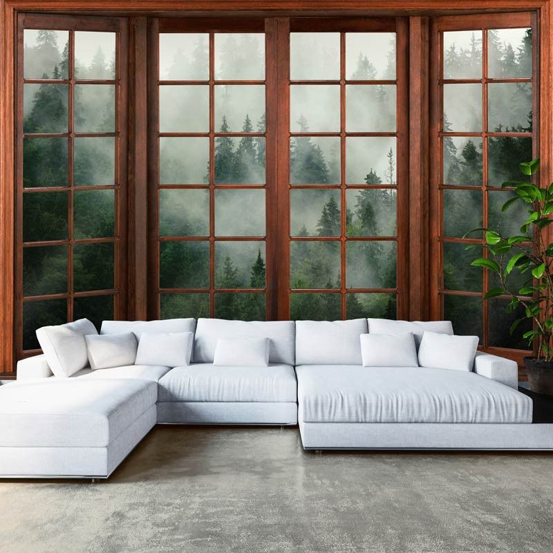 Fototapete 3D-Fensteransicht eines nebligen Waldes
