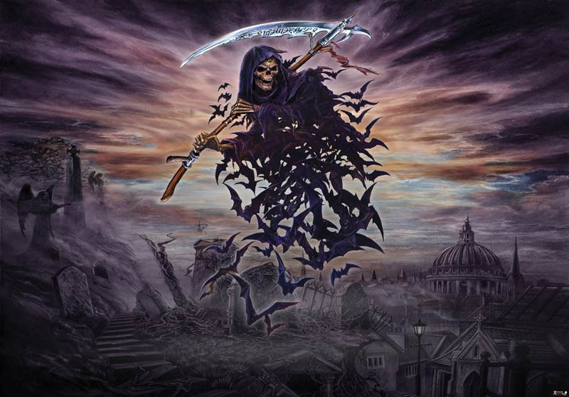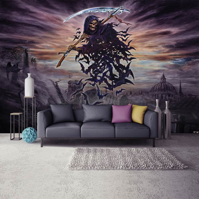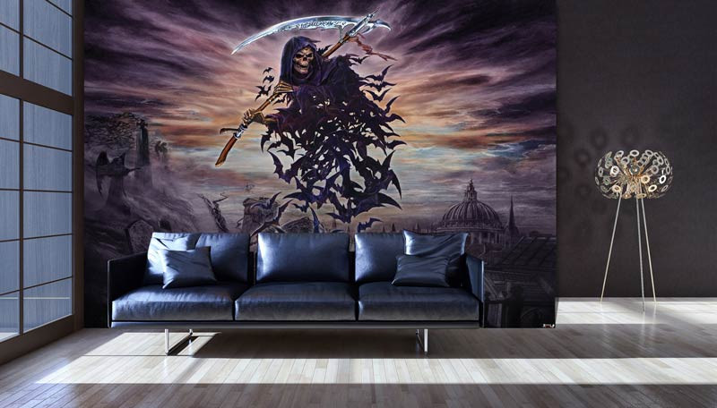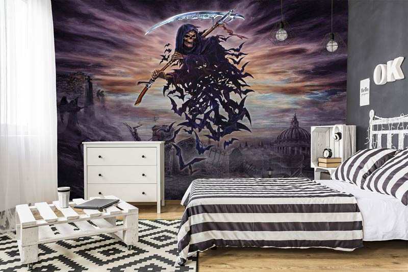 Die Fototapete vom Skelett mit der Sense ist ein echter Hingucker im: Wohnzimmer, Schlafzimmer, Hobbyraum, Mancave, Küche, Flur, Büro oder jedem anderen Raum.